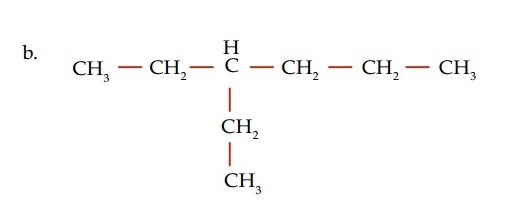 Alkana itu juga memiliki 6 atom karbon pada rantai induk, namun gugus alkilnya bukan metil melainkan etil yang terletak pada atom karbon nomor 3. Sehingga nama senyawa tersebut adalah 3-etilheksana.