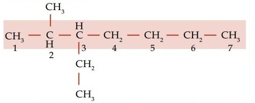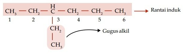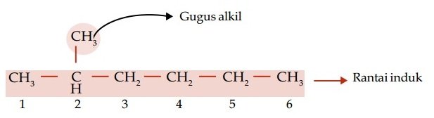 Pada rantai karbon diatas, rantai induk memiliki 6 atom karbon itu artina rantai induk bernama heksana. Kemudian pada gugus alkil terdapat metil (CH3) yang terletak di atom C nomor 2.