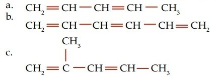 b. Rantai karbon b memiliki atom karbon pada rantai induk jumlahnya 6, tidak memiliki rantai cabang, dan pada atom C nomor 1, 3, dan 5 terdapat ikatan rangkap 2. Sehingga senyawa hidrokarbon tersebut bernama 1,3,5-heksadiena.
