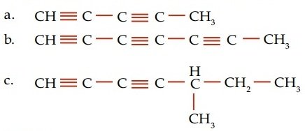 b. Terdapat 7 atom karbon pada rantai induk, tidak memiliki gugus alkil, dan terdapat 3 ikatan rangkap 3 pada rantai karbon nomor 1, 3, dan 5 sehingga tata nama senyawa hidrokarbon ini adalah 1,3,5-heptatriuna.