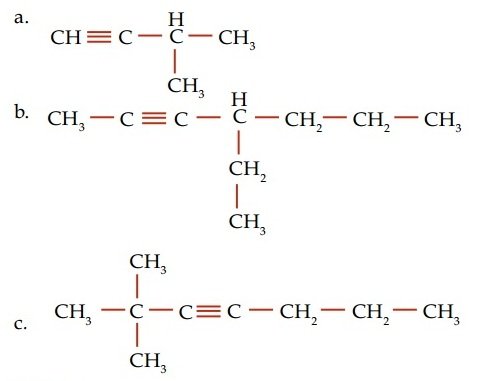 a. Ada 4 atom karbon pada rantai induk, ikatan rangkap 3 terdapat pada atom karbon nomor 1, dan cabang dengan gugus alkil metil terdapat pada atom karbon nomor 3. Dengan demikian, senyawa hidrokarbon ini bernama 3-metil-1-butuna.