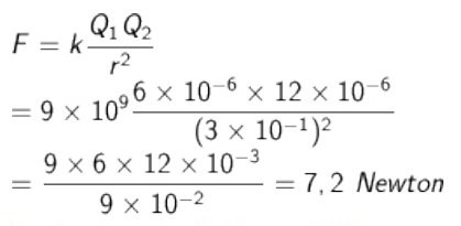 Dua buah muatan masing-masing q1 = 6μC dan q2 = 12μC terpisah sejauh 30 cm. Tentukan besar gaya yang terjadi antara dua buah muatan tersebut, gunakan tetapan k = 9 x 109 Nm2/C2 dalam satuan standar.