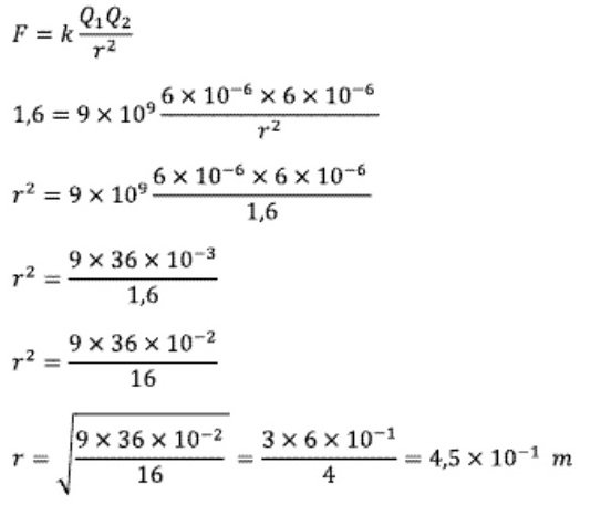 Dua buah muatan listrik memiliki besar yang sama yaitu 6 μC. Jika gaya coulomb yang terjadi antara dua muatan tadi adalah 1,6 N. Tentukan jarak pisah kedua muatan tersebut!