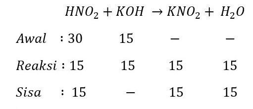 Dicampurkan dua larutan yaitu 200 mL larutan HNO2 0,15 M dengan 150 mL larutan KOH 0,1 M. Berapa pH campuran larutan tersebut… (Ka = 10-5)