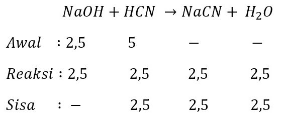 Dari reaksi dapat kita lihat terdapat sisi asam lemah sebesar 2,5 mmol. Jadi pasangan 1 dan 2 termasuk larutan penyangga.