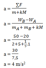 Sistem katrol pada gambar, memiliki data – data mK = 1 kg, mA = 2 kg, mB = 5 kg, dan katrol K dianggap silinder pejal. Jika gesekan katrol dengan poros dan massa tali diabaikan, serta g = 10 m/s2 maka percepatan benda selama gerak adalah …