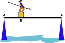 Seorang anak bermassa 100 kg berada diatas jembatan papan kayu bermassa 100 kg yang diletakkan di atas dua tonggak A dan C tanpa dipaku. Sebuah tong berisi air bermassa total 50 kg diletakkan di titik B.