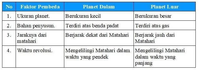 4. Jelaskan perbedaan antara planet luar dan planet dalam.