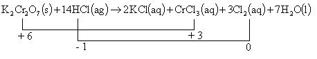 K2Cr2O, (s) + 14HCl (aq) 2KCl(aq) + 2CrCl3 (aq) + 3Cl2 (g) + 7H2O(l)