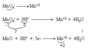 A. MnO4–(aq) + 8 H+ (aq) + 5e → Mn2+ (aq) + 4H2O (l)