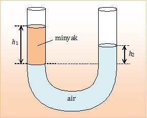 Sebuah pipa U mula-mula diisi dengan air yang massa jenisnya 1000 kg/m3 kemudian pada salah satu pipa dituangkan minyak goreng sehingga posisi stabil tampak seperti gambar. Jika tinggi kolom minyak 8 cm dan kolom air 5 cm, besarnya massa jenis minyak goreng adalah ….