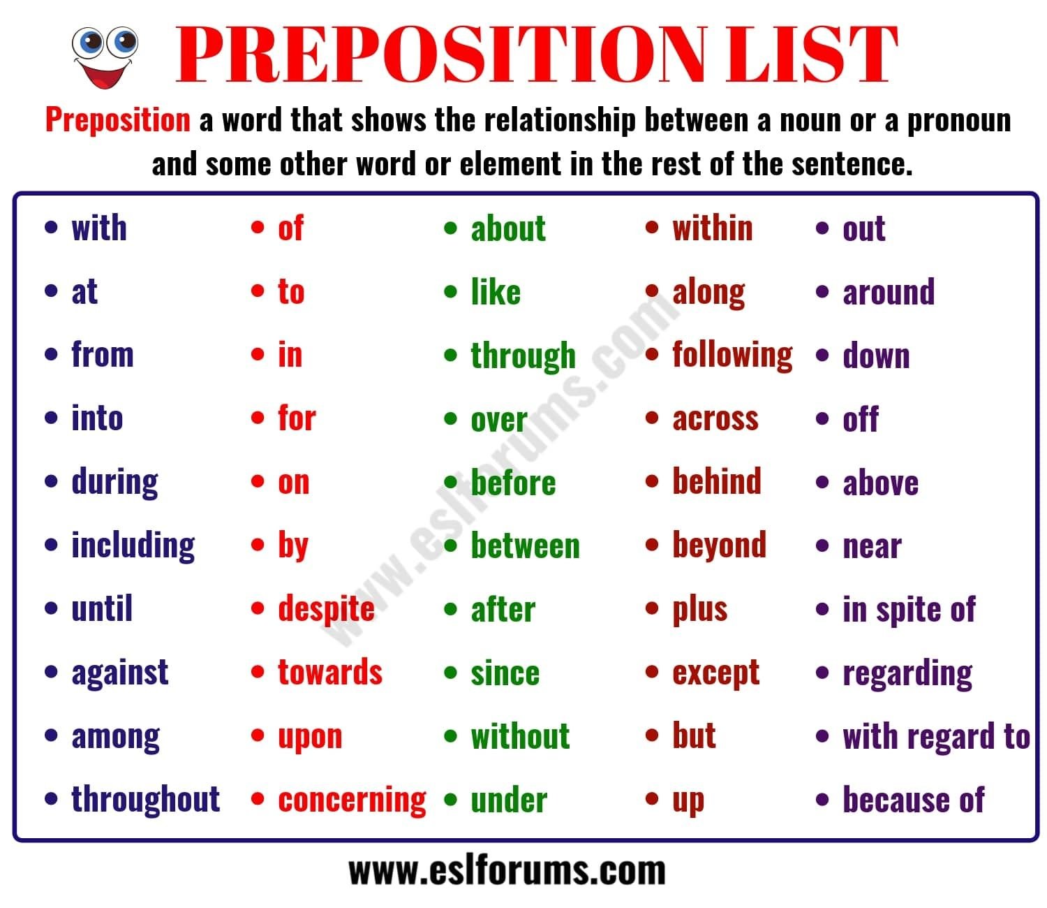 Preposition bisa dikatakan sebagai kata depan. Preposition adalah kata-kata yang digunakan dengan diletakkan didepannya untuk menunjukkan hubungan antara kata-kata ini dengan bagian lain dalam kalimat itu. Memahami penggunaan preposition dalam bahasa Inggris adalah hal yang sangat penting sehingga tidak terjadi kesalahan dalam pemilihan preposition itu sendiri ketika akan menghubungkan antara kata yang satu dengan kata yang lainnya dalam sebuah kalimat bahasa Inggris.