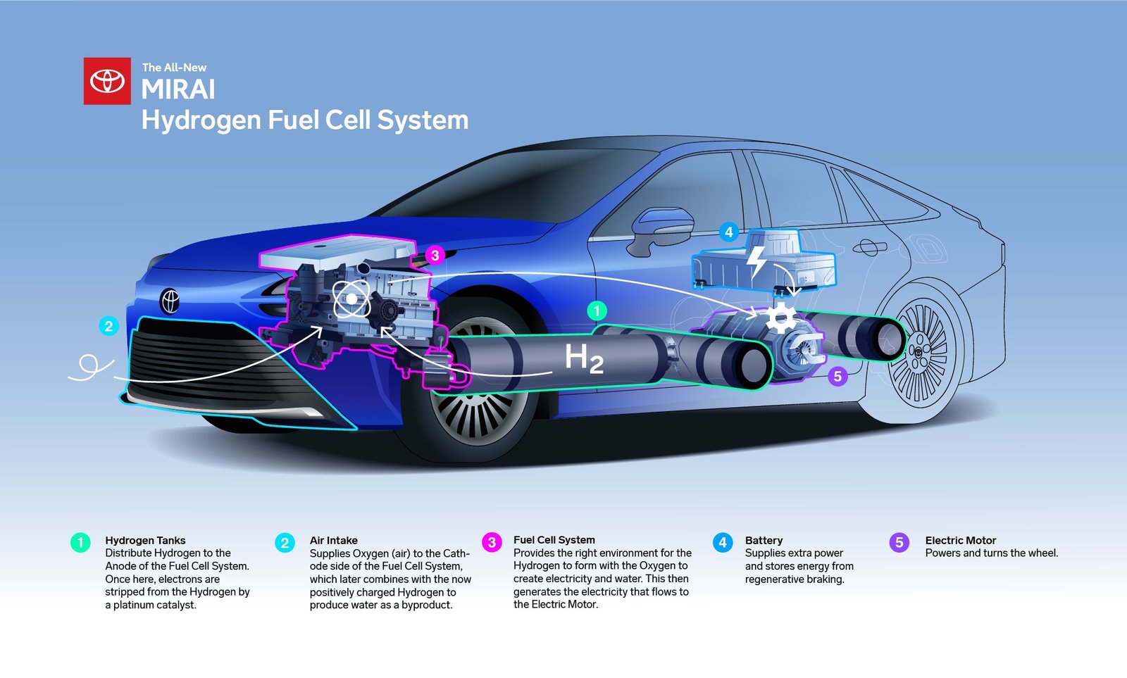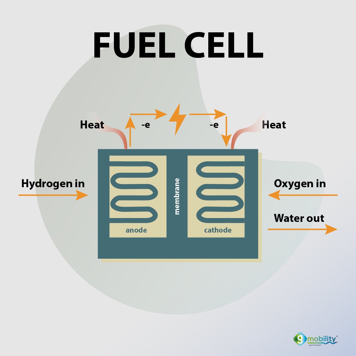 Hydrogen Fuel Cell bekerja mirip dengan baterai, dimana sebuah fuel cell memiliki kutub anoda (-) serta katoda (+). Hidrogen (H2) dialirkan ke kutub anoda yang selanjutnya akan memecah molekul hidrogen menjadi elektron serta ion hidrogen.