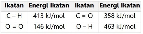 Dengan menggunakan tabel energi ikatan, tentukan energi yang dibebaskan pada pembakaran gas metana!