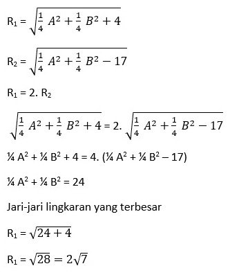 Jika panjang jari-jari lingkaran x2 + y2 + Ax + By – 4 = 0 adalah dua kali panjang jari-jari lingkaran yang x2 + y2 + Ax + By + 17 = 0, maka panjang jari-jari lingkaran yang lebih besar adalah …