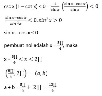 Himpunan semua bilangan real x pada selang (∏, 2∏) yang memenuhi csc x (1 – cot x) < 0 berbentuk (a, b). Nilai a + b adalah …