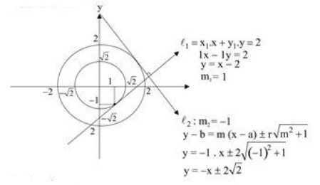 Diketahui dua lingkaran x2 + y2 = 2 dan x2 + y2 = 4. Garis I1 menyinggung lingkaran pertama di titik (1, -1). Garis I2 menyinggung lingkaran kedua dan tegak lurus dengan garis I1. Titik potong garis I1 dan I2 adalah …