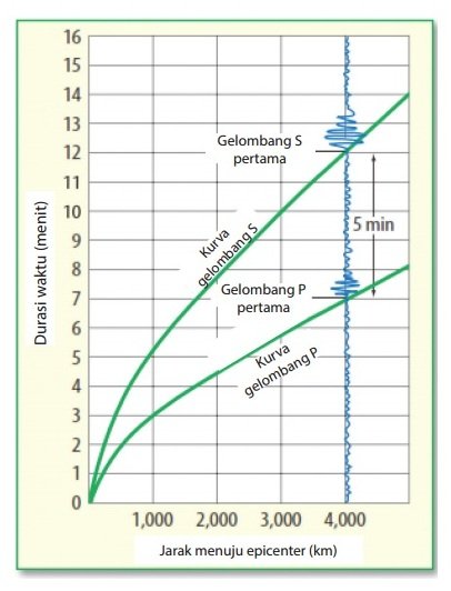 5. Jarak stasiun gempa dari episentrum sebesar 1000 km. Berapakah perbedaan waktu datangnya gelombang primer dan sekunder?