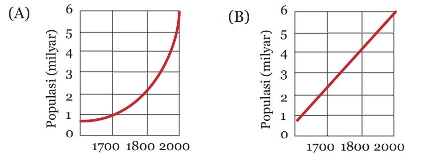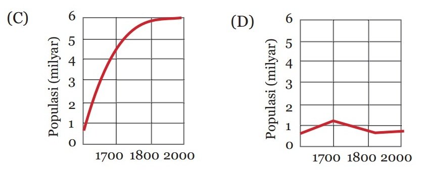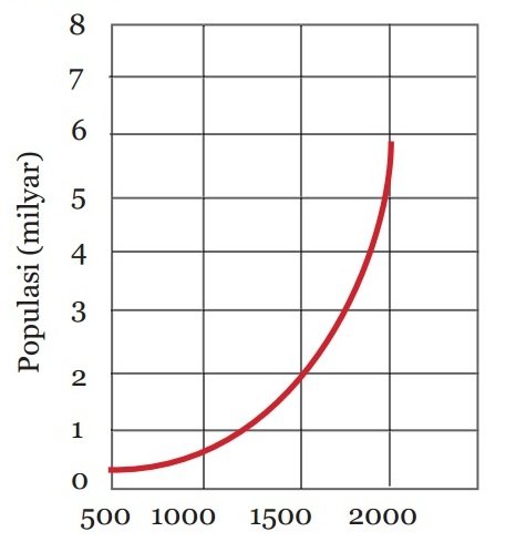 4. Grafik berikut menunjukkan pertumbuhan jumlah penduduk di dunia selama 1.500 tahun. Jelaskan satu alasan mengapa populasi manusia meningkat dengan sangat cepat antara tahun 1.800 dan 2.000!