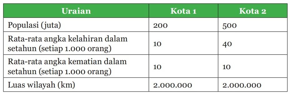 3. Ada lebih dari enam juta penduduk di dunia yang berbagi sumber daya alam. Tabel berikut menunjukkan informasi dari dua kota.