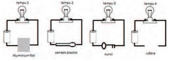 2. Gambar berikut menunjukkan baterai dan lampu yang dihubungkan dengan kawat pada beberapa bahan.