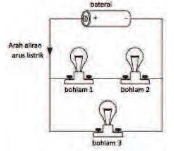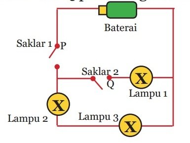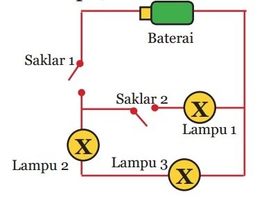 3. Diberikan sebuah rangkaian listrik arus searah terdiri dari tiga buah lampu, dua buah sakelar, dan sebuah sumber arus listrik.