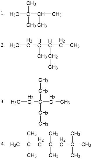 Hitunglah jumlah atom C primer, C sekunder, C tersier, dan C kuarterner pada masing-masing senyawa hidrokarbon berikut!