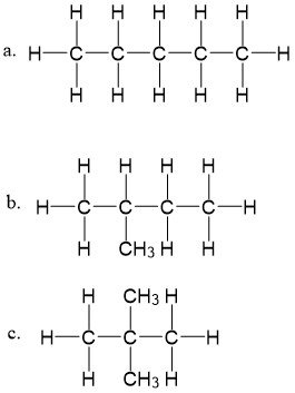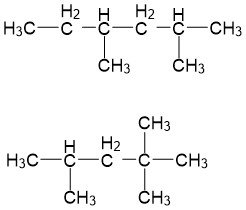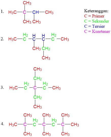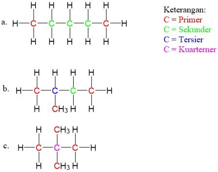 - Atom C primer hanya mengikat 1 atom C lain dalam rantai karbon, sedangkan atom C sekunder mengikat 2 atom C lain dalam rantai karbon, kemudian atom C tersier mengikat 3 atom C lain dalam rantai karbon, dan atom C kuarterner mengikat 4 atom C lain dalam rantai karbon.