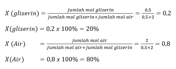 Tentukan fraksi mol kedua substansi dalam larutan yang mengandung 36,0 gram air dan 46 gram gliserin (C3H5(OH)3)