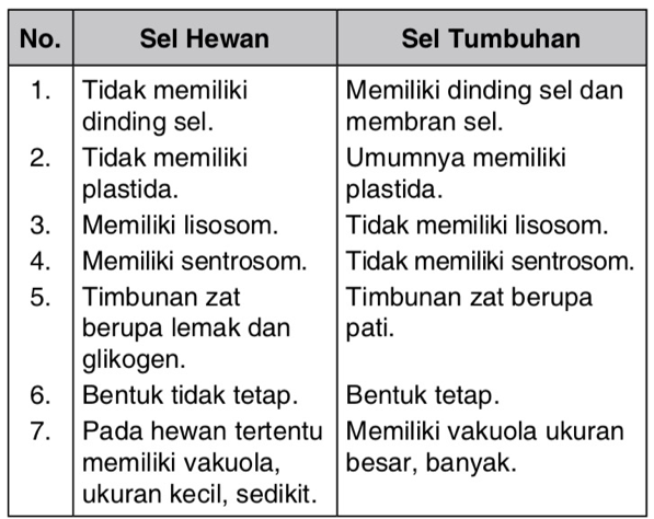 Tabel Perbedaan Sel Hewan dan Sel Tumbuhan