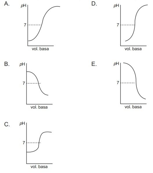 Grafik berikut yang menunjukkan kurva titrasi basa kuat dengan asam lemah adalah ….