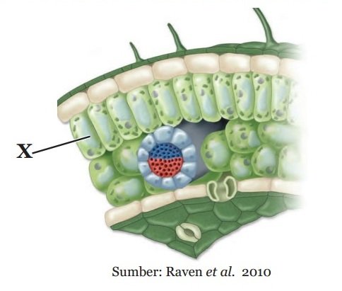 Jaringan yang ditunjukkan oleh huruf X merupakan salah satu jaringan penyusun daun. Jaringan X disebut jaringan ….. dan berfungsi untuk ….
