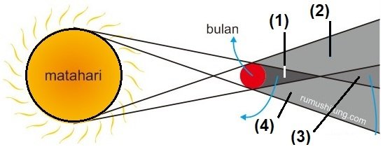 Saat terjadi gerhana matahari total dan gerhana matahari total dan gerhana matahari cincin, berturut-turut pada saat permukaan bumi terkena bayang-bayang bulan bertanda nomor ….