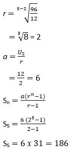 Seorang anak diminta mengisi kelereng pada 5 kotak yang diberi label A, B, C, D, dan E mengikuti aturan barisan geometri. Jika kotak B diisi dengan kelereng sebanyak 12 butir dan kotak E diisi sebanyak 96 butir, jumlah seluruh kelereng yang diisikan ke dalam 5 kotak tersebut adalah ….