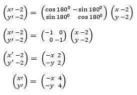 Suatu segitiga KLM dengan titik K(4, 3), L(−1, 2), dan M(3, 5) dirotasikan sejauh 180° dengan pusat rotasi (2, 2). Bayangan ketiga titik tersebut berturut-turut adalah ….