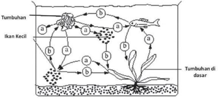 A. Ikan mengeluarkan oksigen dari hasil respirasinya dan oksigen digunakan tumbuhan untuk proses fotosintesis