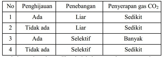 32. Berdasarkan tabel tersebut dapat diketahui bahwa untuk mengurangi pemanasan global melalui penyerapan gas CO2 perlu adanya ….