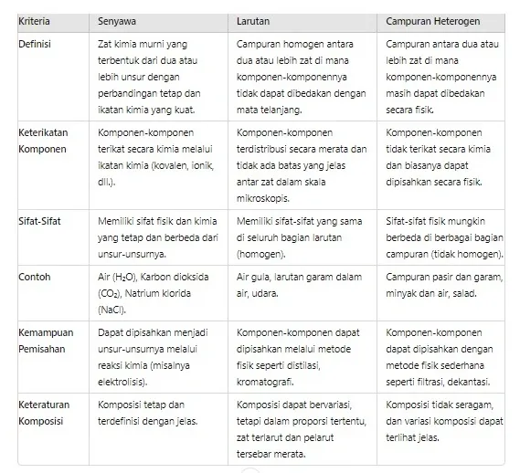 Tuliskan persamaan dan perbedaan senyawa, larutan, dan campuran heterogen