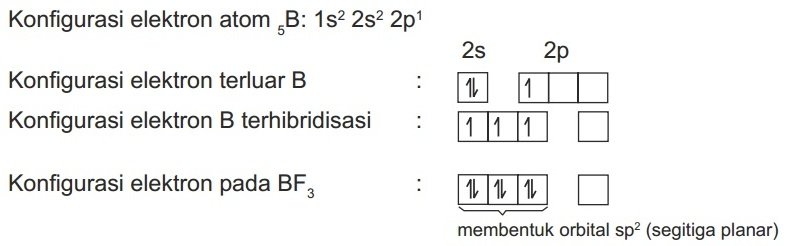 Tiga elektron yang tidak berpasangan pada konfigurasi elektron B terhibridisasi akan berpasangan dengan elektron atom F membentuk ikatan kovalen BF3 dengan bentuk molekul segitiga planar.
