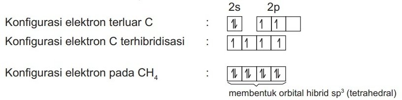 Empat elektron yang tidak berpasangan pada konfigurasi elektron C terhibridisasi akan berpasangan dengan elektron dari atom H sehingga membentuk orbital hibrid sp3 (tetrahedral).