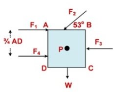 Bekerja pada benda yang memiliki poros putar di titik P. Jika ABCD adalah persegi dengan sisi 4 meter, dan tan 530 = 4/3, tentukan besarnya momen gaya yang bekerja pada benda!