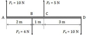 Gaya F1, F2, F3, dan F4 bekerja pada batang ABCD seperti pada gambar.