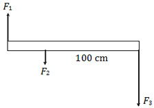 Sebuah batang yang sangat ringan panjangnya 140 cm. Pada batang bekerja tiga gaya masing-masing F1 = 20 N, F2 = 10 N, dan F3 = 40 N dengan arah dan posisi seperti pada gambar.