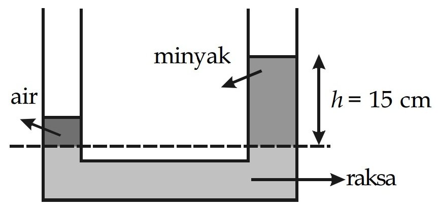 Jika diketahui massa jenis minyak 0,8 g/cm3, massa jenis raksa 13,6 g/cm3, dan massa jenis air 1 g/cm3, tentukanlah perbedaan tinggi permukaan antara minyak dan air.