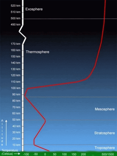 Atmosfer tersusun atas 5 lapisan utama yaitu troposfer, stratosfer, mesosfer, termosfer, dan eksosfer. Setiap lapisan terbentuk dari komposisi gas yang berbeda-beda sehingga kemampuan untuk menyerap energi matahari juga berbeda. Oleh sebab itu, temperatur pada setiap lapisan atmosfer berbeda-beda. Berikut ini adalah grafik lapisan atmosfer berdasarkan temperatur.