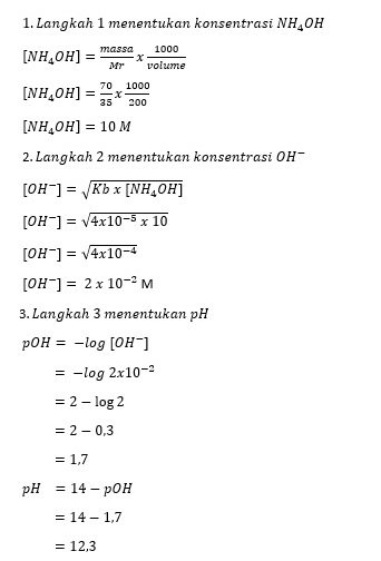 Sebanyak 70 gram NH4OH dilarutkan dalam air sehingga volume larutannya menjadi 200 mL. Hitung pH dari larutan NH4OH Kb = 4 . 10-5. (Ar N = 14, H = 1, dan O = 16)