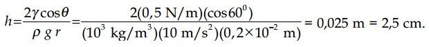 Suatu tabung berdiameter 0,4 cm jika dimasukkan secara vertikal ke dalam air, sudut kontaknya 600. Jika tegangan permukaan air 0,5 N/m dan g = 10 m/s2, tentukanlah kenaikan air pada tabung.