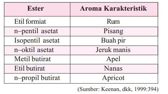 - Senyawa ester dengan rantai pendek (ester yang berasal dari asam karboksilat suku rendah dengan alkohol suku rendah) banyak terdapat dalam buah-buahan yang menimbulkan aroma dari buah tersebut, sehingga disebut ester buah-buahan.