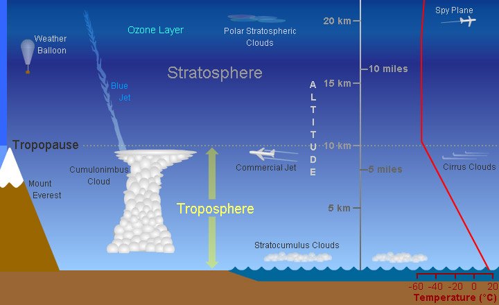 Lapisan troposfer adalah lapisan atmosfer bumi yang berada pada ketinggian 0 – 18 km di atas permukaan bumi dengan ketebalan rata-rata 10 km. Temperature troposfer disetiap daerah berbeda-beda. Di daerah katulistiwa (16 km) temperatur rata-rata troposfer adalah 800C, didaerah sedang (11 km) temperatur rata-rata troposfer adalah 540C, dan didaerah kutub (8 km) termperatur rata-rata troposfer adalah 460C.