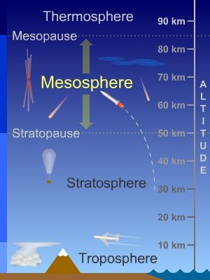 Lapisan mesosfer terdapat pada ketinggian sekitar 50 km – 80 km. Lapisan mesosfer tidak ada gas yang dapat menahan radiasi sinar Matahari. Suhu pada lapisan Mesosfer dapat mencapai -140C. Fungsi utama lapisan mesosfer adalah mengikis dan membakar benda-benda asing yang akan masuk ke Bumi.